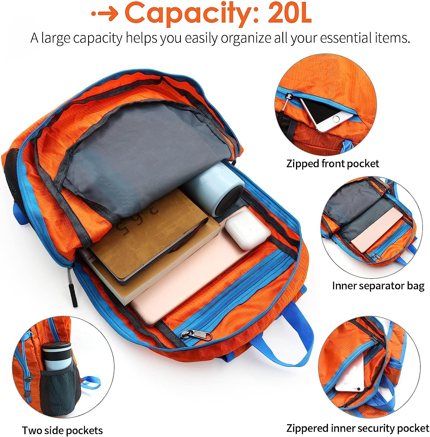 【Large Capacity & Multi-Compartment】The lightweight foldable daypack has 20L internal space and three zippered compartments which make it can keep things organized. This small camping backpack has a large main pocket for your computer and clothes, a smaller outer pocket for quick access items, and a zippered inner pocket for valuables. Two large sides mesh pockets are the perfect place for water bottles or umbrellas to help you easily organize all your essential items.