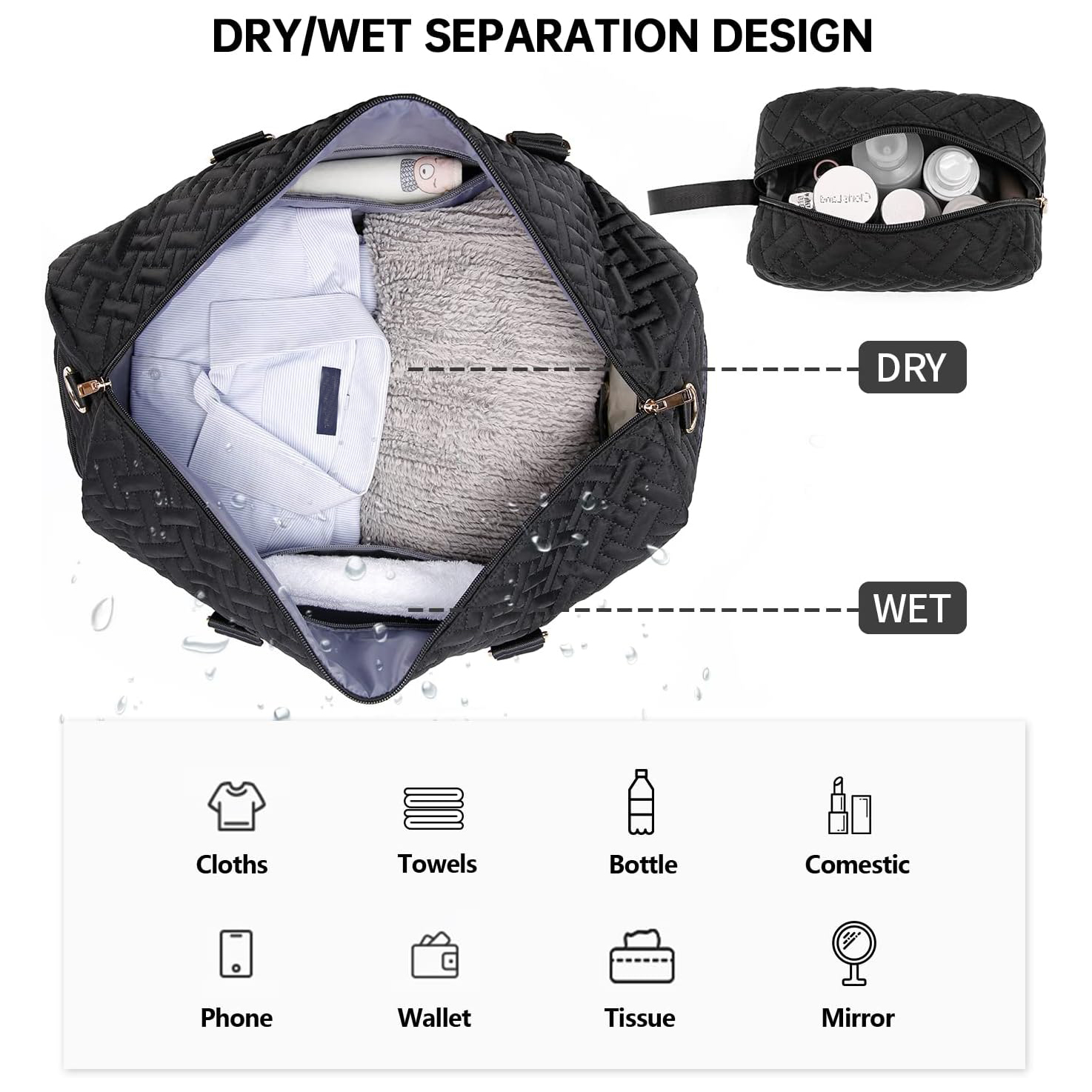 Travel Duffle Bag for Women Weekend, Hospital Bags with Toiletry Bag, Weekender Bags with Shoe Compartment, Carry On Overnight Holdall Bag for Women, Gym Bag with Wet Pocket Black / ItemYH02-168